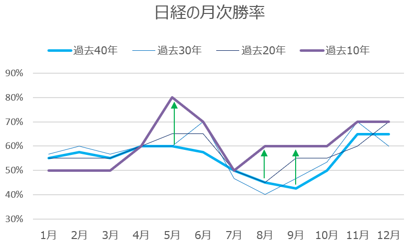 興味深いのは直近10年の変化である。5月は勝率80%、6月は70%、8月・9月も60%と改善している。これは、近年の日経平均が構造的な上昇トレンドに入ったことで、勝率が底上げされていることを示唆している。
