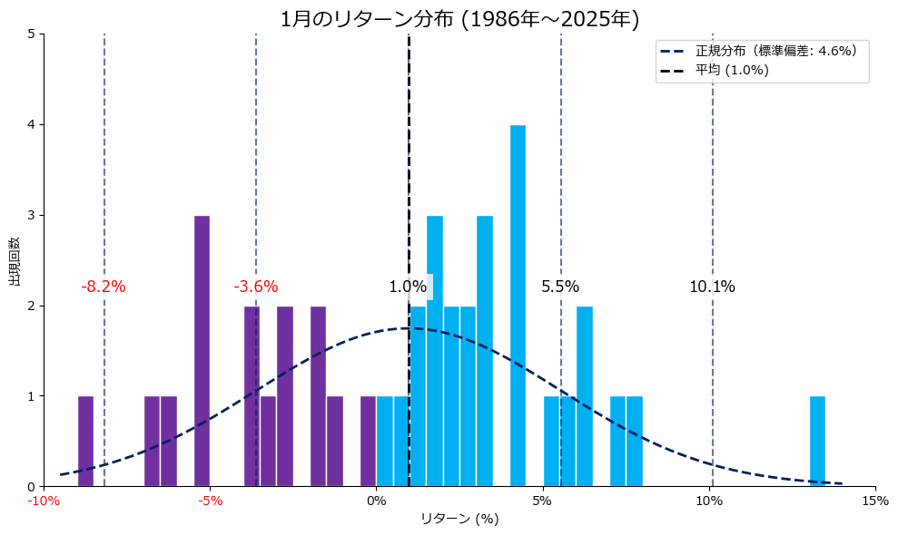 以下が、過去40年の1月の月間リターンの出現回数を0.5%刻みに分けてカウントして棒グラフ化した分布図(ヒストグラム)である。尚、この分布図は、例えば0%とから0.5%のリターン(横軸)が1回出現した(縦軸)、4%から4.5%のリターン(横軸)が4回出現した(縦軸)と読む。