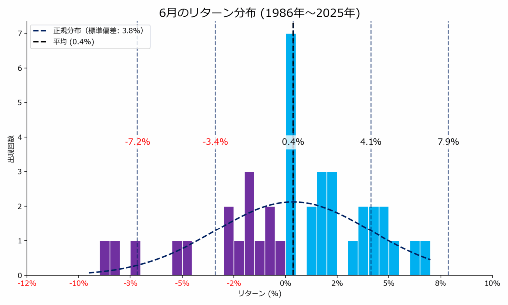 過去40年の6月の月別リターンの出現をプロットしたのは以下の図である。この図では、リターンの出現回数を0.5%刻みにカウントして棒グラフ化したもの(ヒストグラム)である。