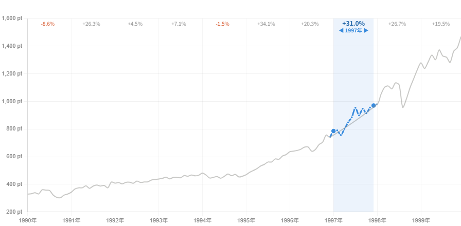 記事の冒頭で紹介したグラフを、再度確認してみよう。1997年は右肩上がりの強い上昇相場だったことがわかる。 4回の下落はチャート上ではほんのわずかな「揺らぎ」にしか見えない。