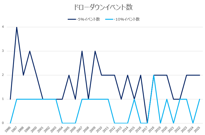 以下が年間平均のドローダウンイベントの発生回数である。100万円運用していて、5万円以上、一時的に損することは、年に1.7回起こる、普通のイベントだとわかる。-10%となるとやや少なくなるが、それでも1.7年に1回は起こるイベントだ。