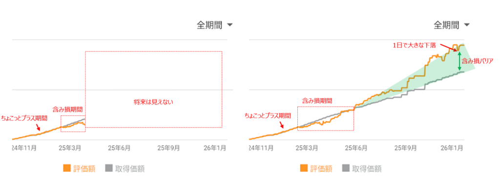 この積みあがった含み益は、俗にいう「含み益バリア」と呼ばれるという精神的な安心感をもたらす。以下が含み益バリアができる前と後の対比だ。